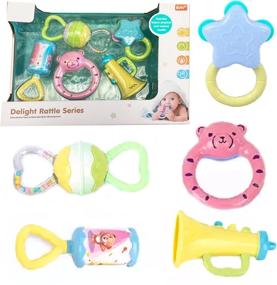 De eerste levensjaren van jouw kleine staan bol van de ontwikkeling. Zo wordt de fijne motoriek al van jongs af aan ontwikkeld, en ook de zintuigen worden gevormd. Met deze uitgebreide rammelaar set help je deze ontwikkeling. Pak de verschillende rammelaars vast, schud voor geluid en voel de verschillende vormen en texturen. Leer geluiden, kleuren en vormen herkennen, en voorkom een verveelde baby!