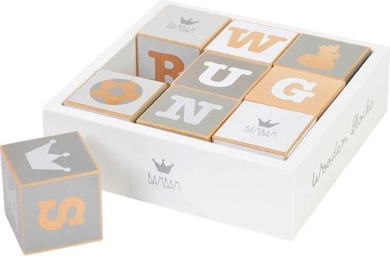 Mooie robuuste blokkendoos van hout met letter en leuke prints op de blokken. Leuk en leerzaam tegelijk!