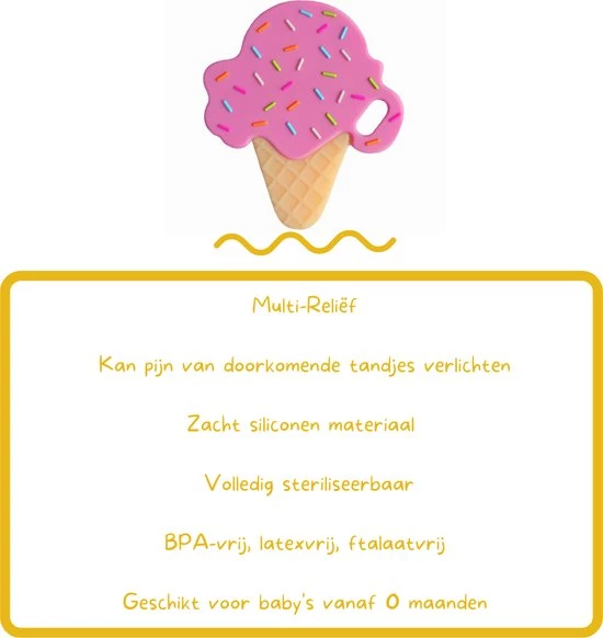 TIP! Leg de bijtring even in de koelkast. Dit heeft een verkoelende werking (Dat doen ijsjes nou eenmaal), wat pijn kan verlichten van doorkomende tandjes. Deze bijtring is tevens ook bruikbaar als badspeelgoed en door het leuke design van deze bijtring, dient het ook als leuke decoratie in de kinderkamer.