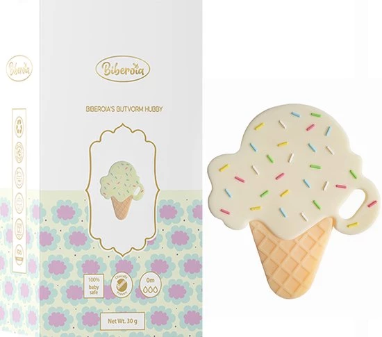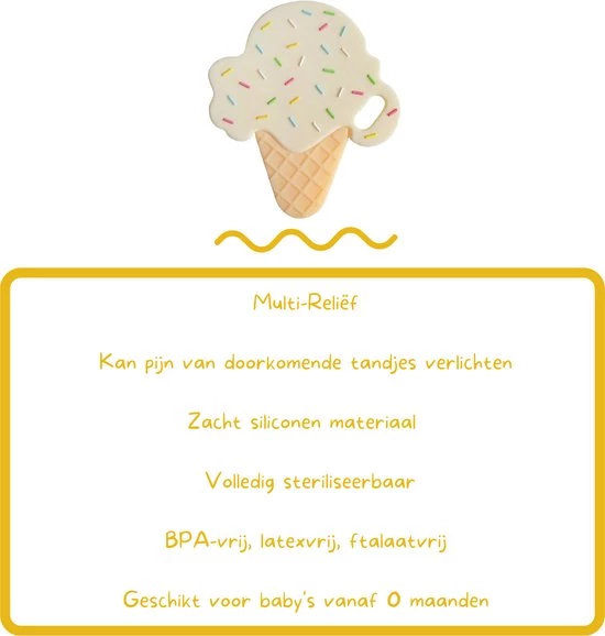 TIP! Leg de bijtring even in de koelkast. Dit heeft een verkoelende werking (Dat doen ijsjes nou eenmaal), wat pijn kan verlichten van doorkomende tandjes. Deze bijtring is tevens ook bruikbaar als badspeelgoed en door het leuke design van deze bijtring, dient het ook als leuke decoratie in de kinderkamer.