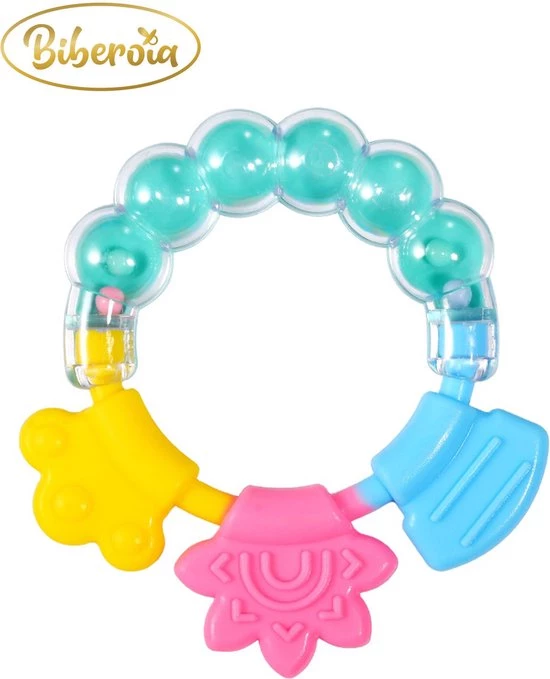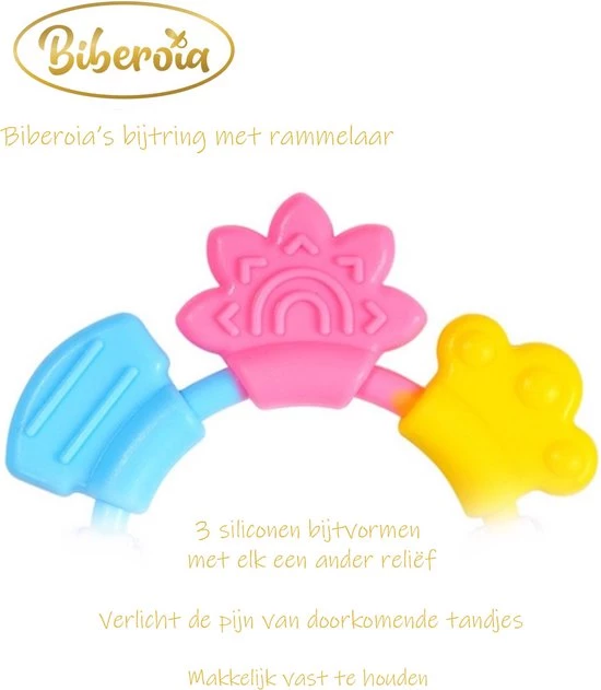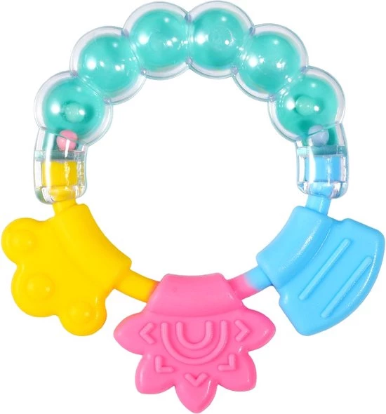 De bijtvormpjes zijn er in 3 verschillende vormen en hebben elk een ander reliëf. Ze zijn van zacht siliconen materiaal en kunnen pijn van doorkomende tandjes verlichten. De rammelaar is doorzichtig, gevuld met enkele gekleurde balletjes. Door ermee te schudden zal je kleintje snel de aandacht krijgen voor dit leuke, handige speeltje!