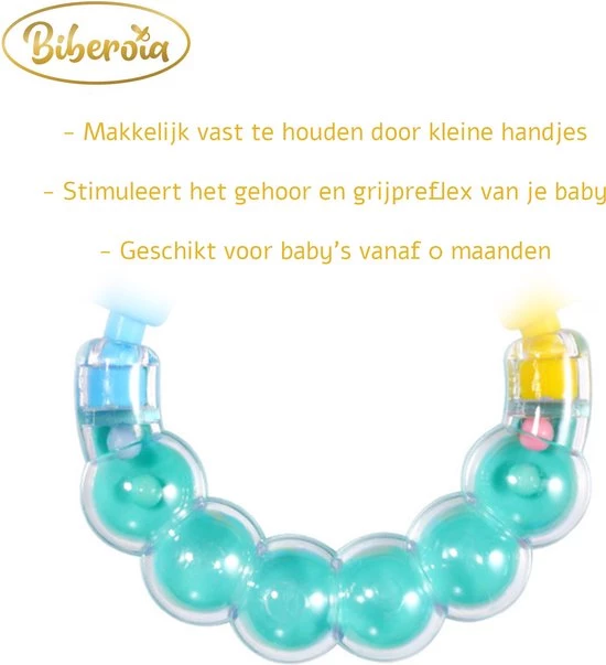 Dit vrolijke babyspeeltje wordt het favoriete speeltje van je kleintje! De felle kleurtjes van de bijtvormpjes en het geluid van de rammelaar, stimuleren de visuele zintuigen en het gehoor van je baby. Door de vorm is dit speeltje makkelijk vast te houden door kleine handjes. Dit stimuleert het grijpreflex van je baby.