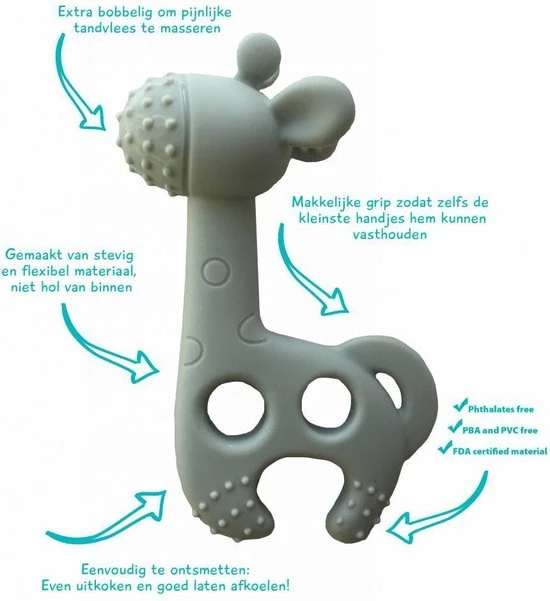 Bite Me Raff Bijtring – Blue Grey Vrij van ftalaten, PBA en PVC vrijAls de tandjes bijna doorkomen van je kleine is het Bite me Raff bijtfiguurtje superhandig. Door de openingen is de bijtring makkelijk vast te houden voor je kleine.Daarnaast is het Bite me Raff bijtfiguurtje een geliefd speelmaatje voor je kleine doordat deze fijn aanvoelt en een mooie zachte kleur heeft.De bijtring is vrij van ftalaten, PBA en PVC vrij en gemaakt van FDA gecertificeerd materiaal. Het product wordt geleverd in een ECO-look verpakking en blijft ook leuk om als kraamcadeautje te geven.Afmetingen: