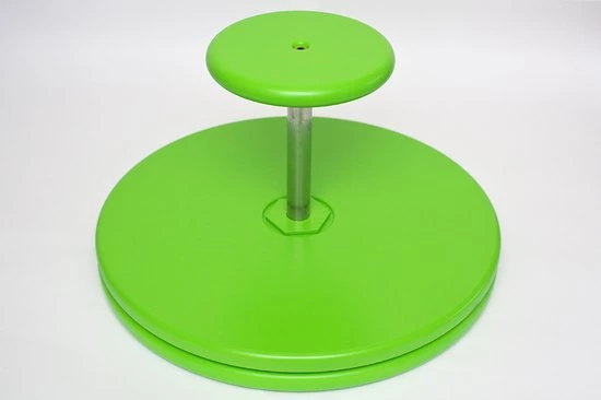 De stevige plastic basis herbergt een draaibaar zitplatform dat roteert als kinderen aan het ronde centrale wiel trekken.