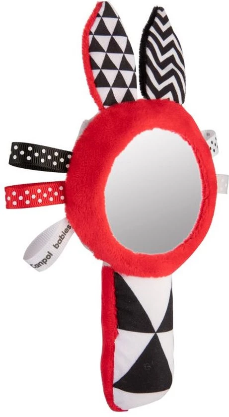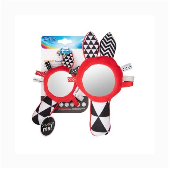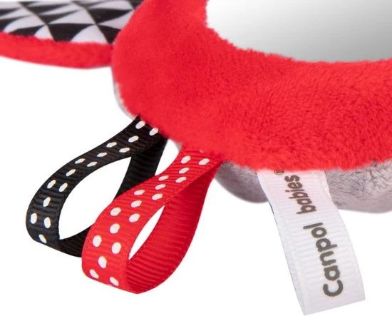 Contrasterend speelgoed met een piep uit de SENSORY TOYS collectie heeft interactieve elementen die het kind lang bezig zullen houden. Het ondersteunt de ontwikkeling van de baby vanaf de eerste dagen. Het stimuleert het gezichtsvermogen dankzij rood en zwart – de kleuren die de baby het eerst ziet. Het speelgoed is perfect om te leren vangen en om interessante nieuwe geluiden te ontdekken. Het is licht en handig, waardoor het gemakkelijk vast te houden is in de handjes van kleine kinderen. De spiegel die in het speelgoed is geplaatst, moedigt het kind aan om te spelen – kleintjes kijken graag in de spiegel en kijken naar de wereld. Het speelgoed heeft grappige oren, kleurrijke linten en een pieper. Het is zacht en aangenaam om aan te raken, bedoeld voor kinderen van 0m +. De spiegel is gemaakt van een materiaal dat veilig is voor kinderen.