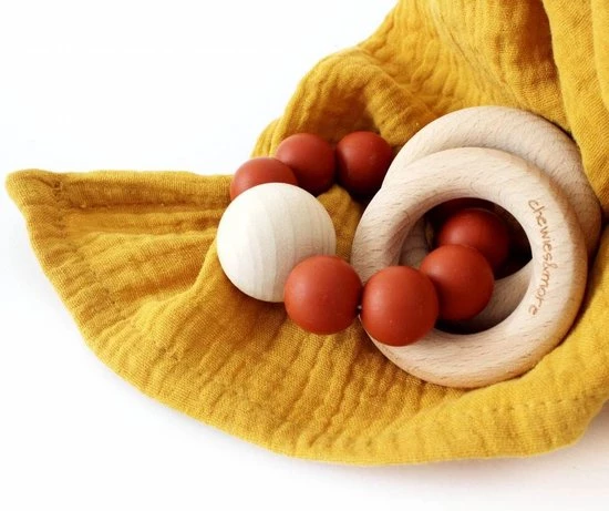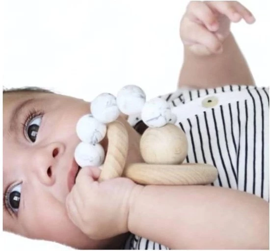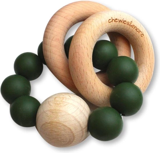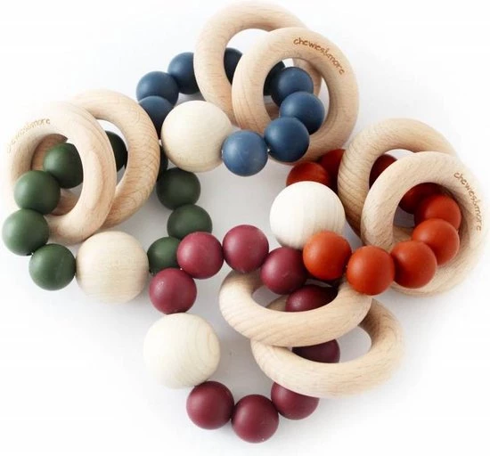 Deze toffe Chewie Rattle is gemaakt van silliconen kralen in combinatie met een grote houten kraal en 2 ringen die makkelijk vast te houden zijn voor je kleintje en een rustgevend rammelend geluid maken.