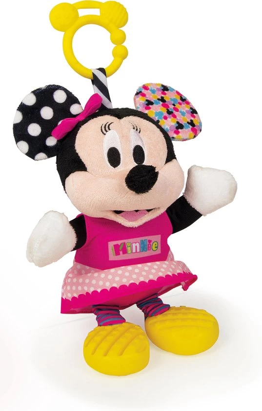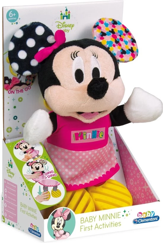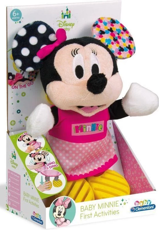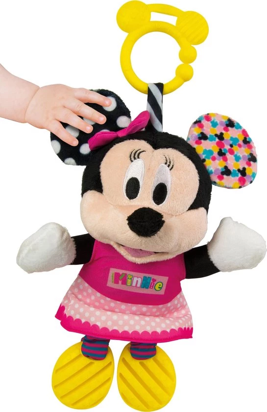 Een schattige Baby Minnie-knuffel met eenvoudige activiteiten, speciaal ontwikkeld voor jonge kinderen, met levendige kleuren om hun interesse te wekken en zicht te stimuleren. Dankzij de zachte, knisperende oren, een rammelaar, piepende buik en rekbare benen helpt deze schattige knuffel kinderen met de ontwikkeling van hun zintuiglijke vaardigheden. De bijtvoetjes van Baby Minnie zijn perfect geschikt voor doorkomende tandjes!