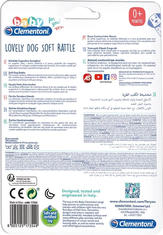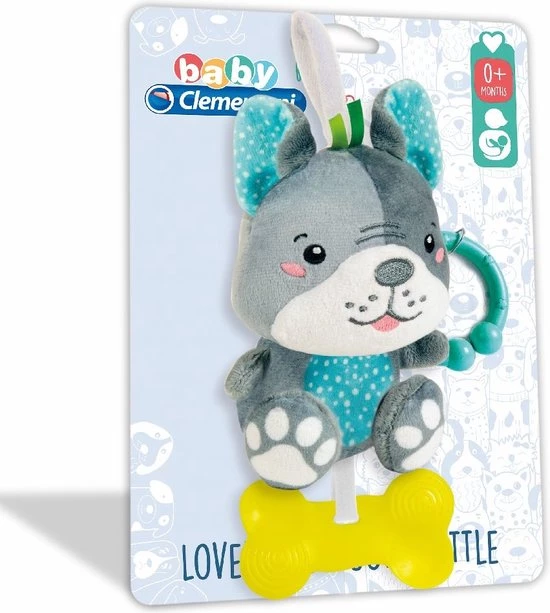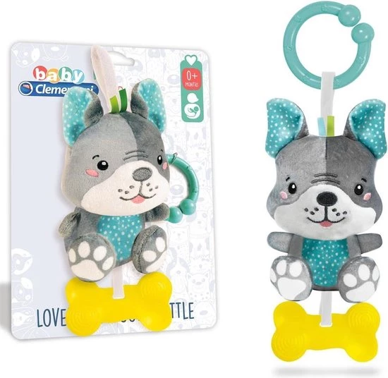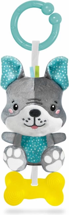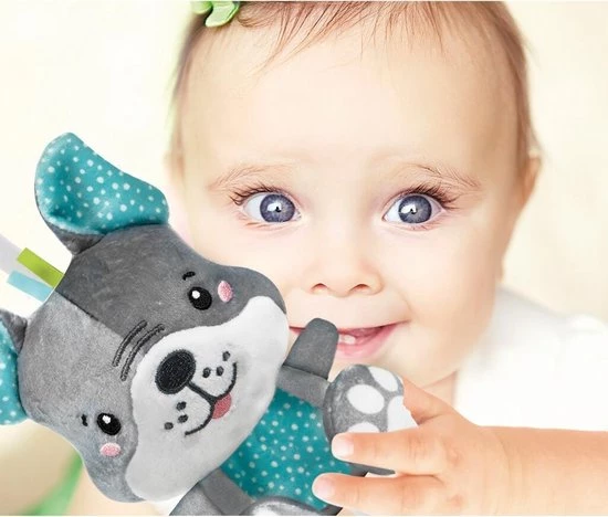 Hang deze rammelaar aan een wieg of wandelwagen zodat jouw kind altijd kan genieten van deze zachte hond! Met een ritselbuik is het leuk om de hond een knuffel te geven en de kunststof vormen zijn ideaal om vast te pakken!