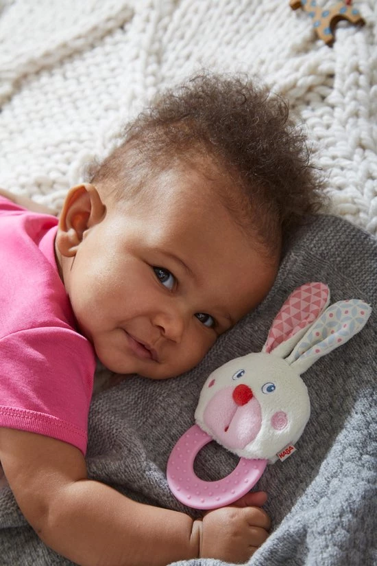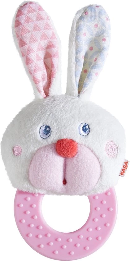 HABA Bijtfiguur Haas. Deze snoezige bijtfiguur helpt baby’s bij het krijgen van tandjes en biedt hen veel speelplezier en ontspanning, terwijl ze op de kunststofring met noppen bijten. Hierbij stimuleert hij ze om te grijpen en te spelen.