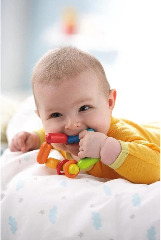Rammelaar van Haba met twee beweeglijke kunststof ringen en een doorkijkje speciaal ontwikkeld voor de allerkleinsten.