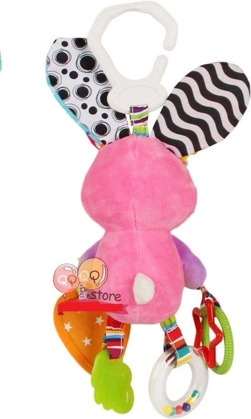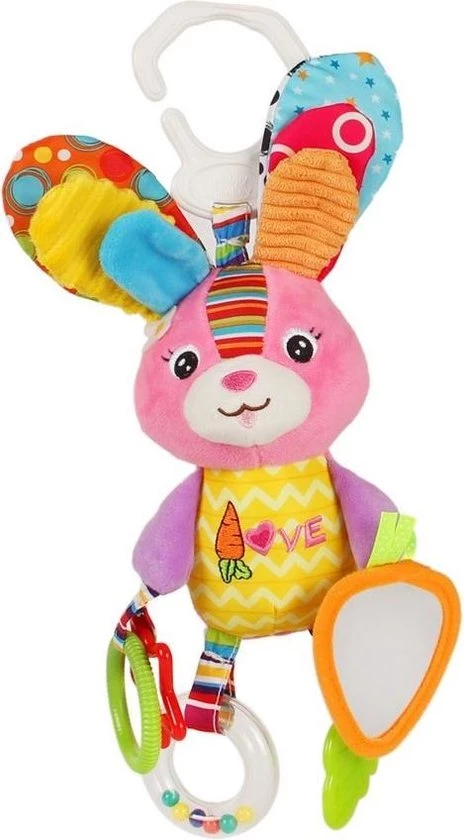 Een schattige konijn met rammelaar en zacht piep geluidje in de buik. Het konijntje kun je ophangen aan de klip en zit boordevol voelelementen, rammelaar en spiegeltje. De zachte flaporen hebben allerlei verschillende stofjes met knispergeluidjes. Dit babyspeelgoed stimuleert reflexen en geeft veel plezier bij allerlei uitdagingen.