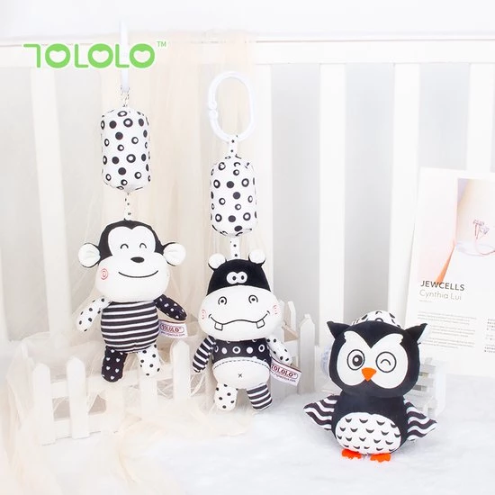 rammelaar hangende pop, kleurrijke cartoonvorm. Als je het zachtjes schudt, maakt het een geluid van een bel, en het geluid is helder en erg mooi! De pop heeft een ingebouwde BB om de polskracht en het gehoor van de baby te oefenen. Het speelgoed op een karretje of een klein bedje hangen is erg handig!