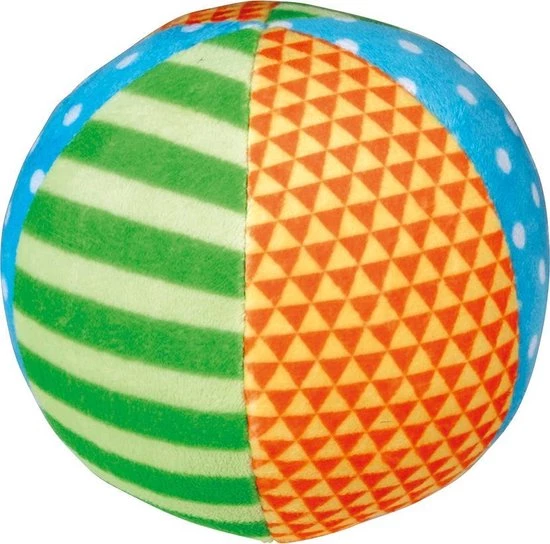 Dit is geen normale bal maar een rammelaar, de rammelaar is heel zacht en heeft drie verschillende patronen in mooie kleuren op de vlakken.