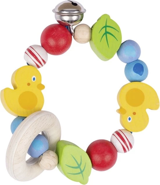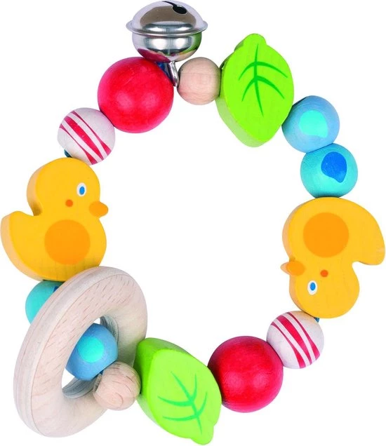 Leuke en vrolijke bijtring eend van hout met elastiek.