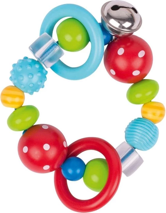 Vrolijke bijtring van het merk Heimess in plastic uitvoering, met elastiek. Deze bijtring is gemaakt voor kleine babyhandjes en nodigt uit tot grijpen en voelen.
