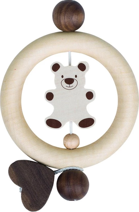 Mooie naturel houten grijpring met een beertje. Deze grijpring is gemaakt voor kleine babyhandjes en nodigt uit tot grijpen en voelen, het vrolijke belletje zal rinkelen.