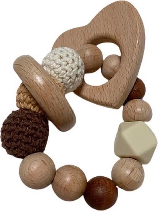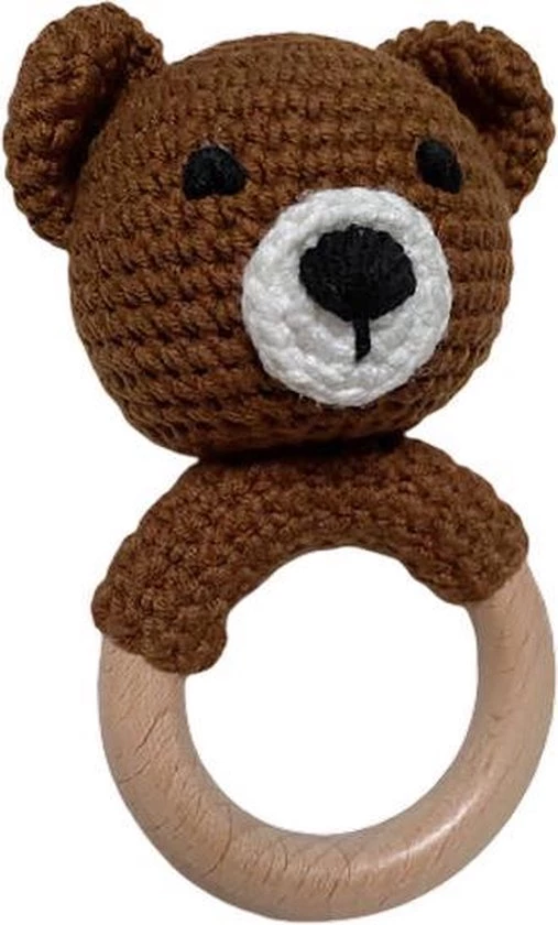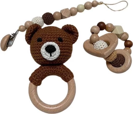 Het setje bestaat uit een ringrammelaar met knuffelbaar bruin beertje, bijtring & speenkoordje en is gemaakt van duurzame & natuurlijke materialen; beukenhout en wol. Ook zijn de oogjes van wol in plaats van plastic. De setjes worden handgemaakt.