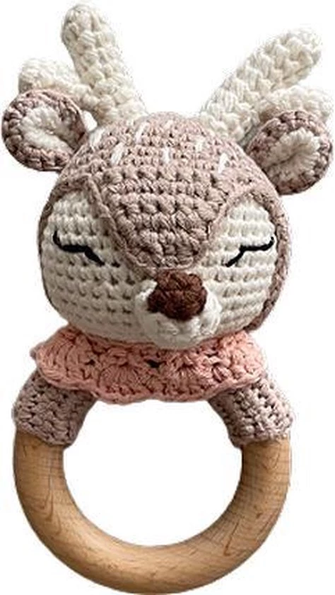 Het setje bestaat uit een ringrammelaar met knuffelbaar hertje, bijtring & speenkoordje en is gemaakt van duurzame & natuurlijke materialen; beukenhout en wol. Ook zijn de oogjes van wol in plaats van plastic. De setjes worden handgemaakt.
