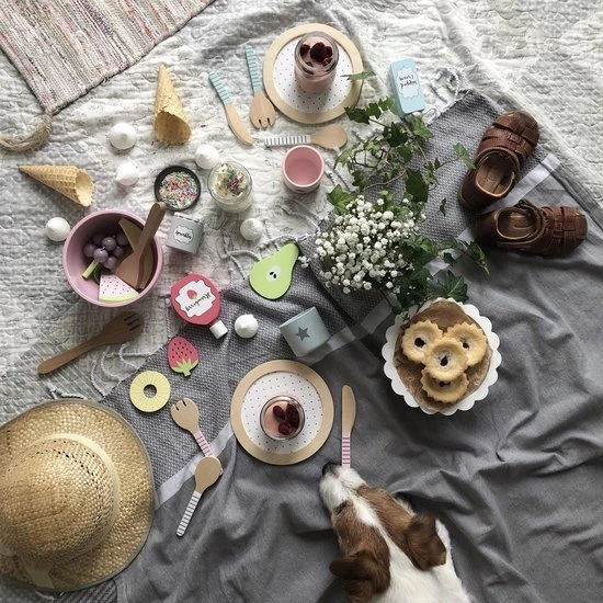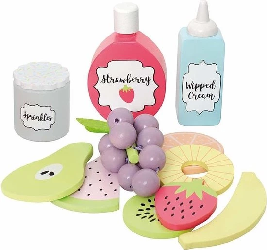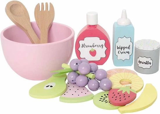 Speel set met alles wat je nodig hebt om een lekkere verse fruitsalade te maken! Meng al het fruit in de fijne houten kom en serveer met slagroom, aardbeienjam en hagelslag. Serveer met het bijgeleverde saladebestek. Je kunt de vruchten ook apart serveren. Wie kan dit weerstaan? Onze saladeset bevat: