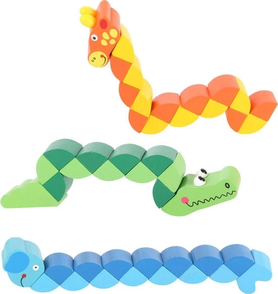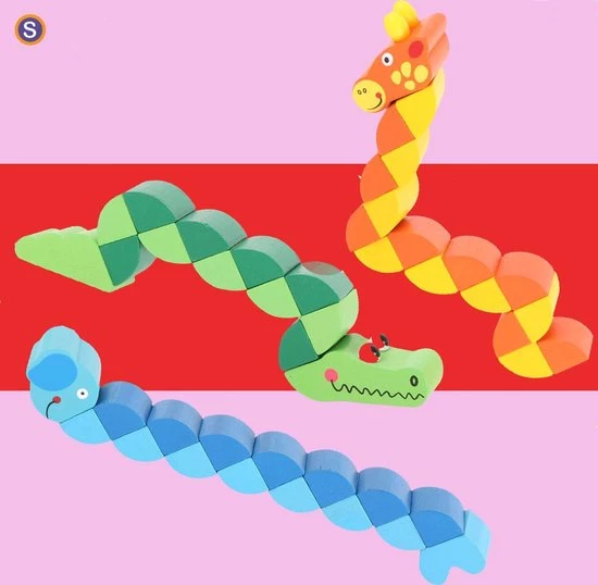 De houten schakels kunnen alle kanten opgedraaid worden, waardoor je de speeltjes allerlei vormen kunt geven.