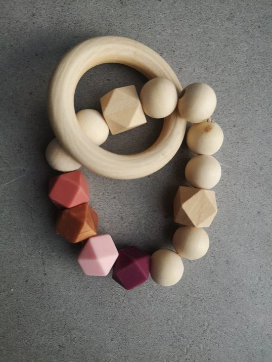 Deze bijtring met houten en siliconen kralen is super fijn voor jouw kleintje bij doorkomende tandjes.