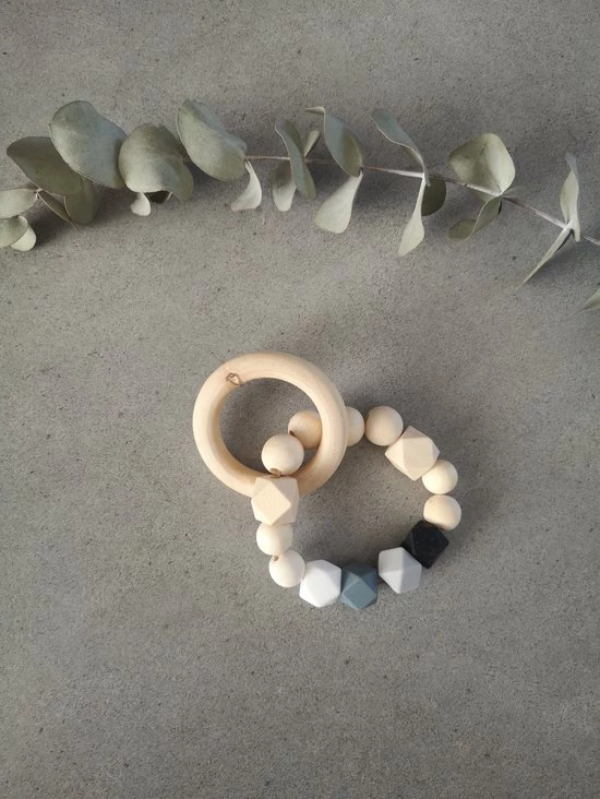 Deze bijtring met houten en siliconen kralen is super fijn voor jouw kleintje bij doorkomende tandjes.