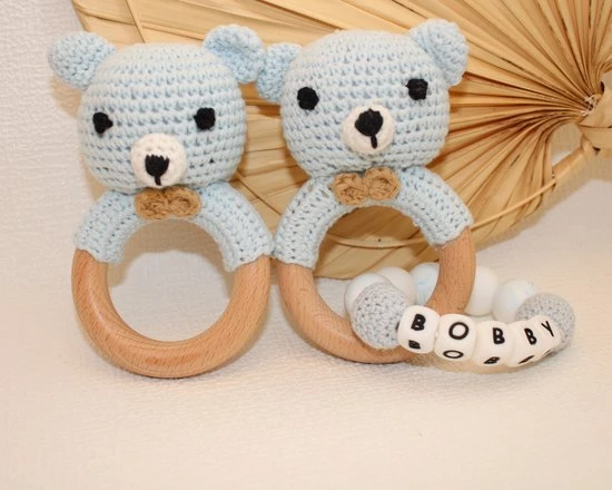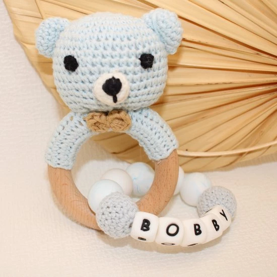 De houten rammelaar met een schattig gebreid beer heeft een belletje waar de baby lekker mee kan zwaaien. De ring die eraan gekoppeld is heeft siliconen en gehaakte kralen die te combineren is met de naam van de baby, hier kan hij of zij in bijten en vinden baby’s het leuk om ermee te spelen.