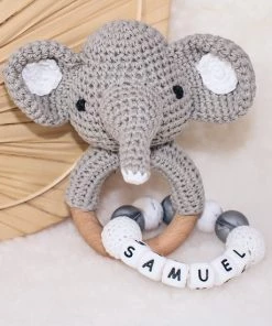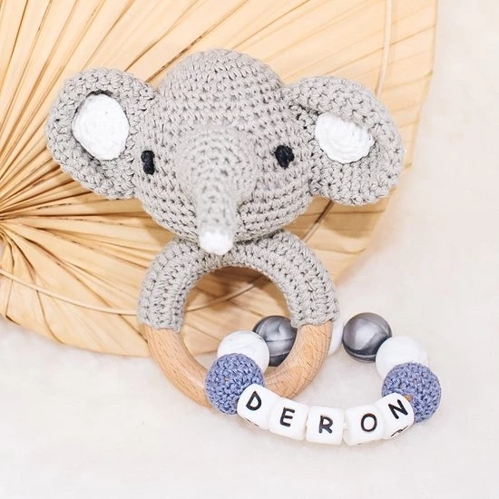 De houten rammelaar met een schattig gebreid olifant heeft een belletje waar de baby lekker mee kan zwaaien. De ring die eraan gekoppeld is heeft siliconen en gehaakte kralen die te combineren is met de naam van de baby, hier kan hij of zij in bijten en vinden baby’s het leuk om ermee te spelen.