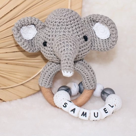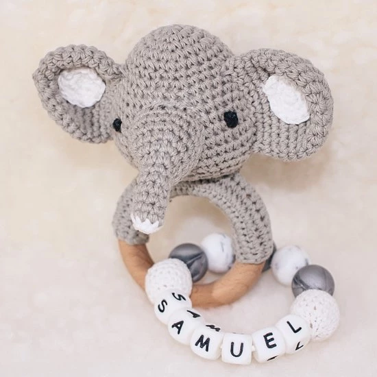 De houten rammelaar met een schattig gebreid olifant heeft een belletje waar de baby lekker mee kan zwaaien. De ring die eraan gekoppeld is heeft siliconen en gehaakte kralen die te combineren is met de naam van de baby, hier kan hij of zij in bijten en vinden baby’s het leuk om ermee te spelen.