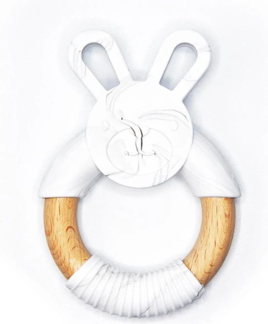 Dit lieve konijntje is leuk om mee te spelen en lekker om op te sabbelen en kauwen. Het gekleurde gedeelte van het konijntje is van silicone (BPA-vrij). De houten ring is gemaakt van beukenhout, dit splintert niet. Dit maakt het hele konijntje bijtveilig.