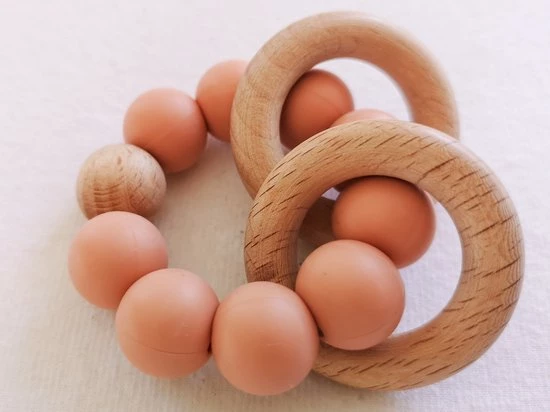 Een heel fijne bijtring, gemaakt van silicone kralen en houten ringen, 100% veilig voor jou kleintje. Perfecte formaat voor baby handjes in verschillende kleuren.
