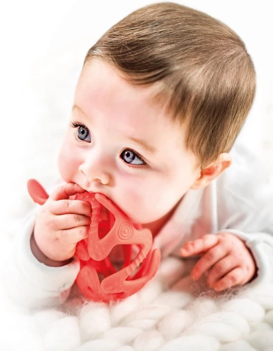 De volledig uit silicone gemaakte bijtbal is een leuke oplossing voor de periode van doorkomende tandjes bij baby’s. Er kan op de hele bal gebeten worden en de verschillende zachte bijtoppervlakken helpen bij het doorkomen en versterken van de tandjes. Pijnlijk tandvlees wordt zachtjes gemasseerd en de bal stimuleert daarnaast ook de lippen en tong. De speelse vorm van deze bijtbal kan gemakkelijk vastgehouden worden door kleine handjes.