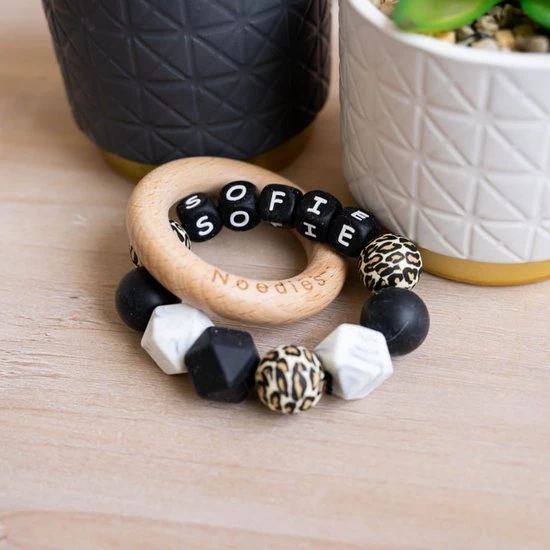 Het stoere zwart, gecombineerd met de luipaardprint en het tijdloze marmer is helemaal hot. De bijtring met naam is een perfect baby cadeau voor jongens en voor meisjes. Ook in de box of op het speelkleed kan deze bijtring rustgevend werken en een uitkomst voor de pijnlijke tandjes. Bij Noedies Babygoodies stel je de bijtring eenvoudig zelf samen, met of zonder naam.