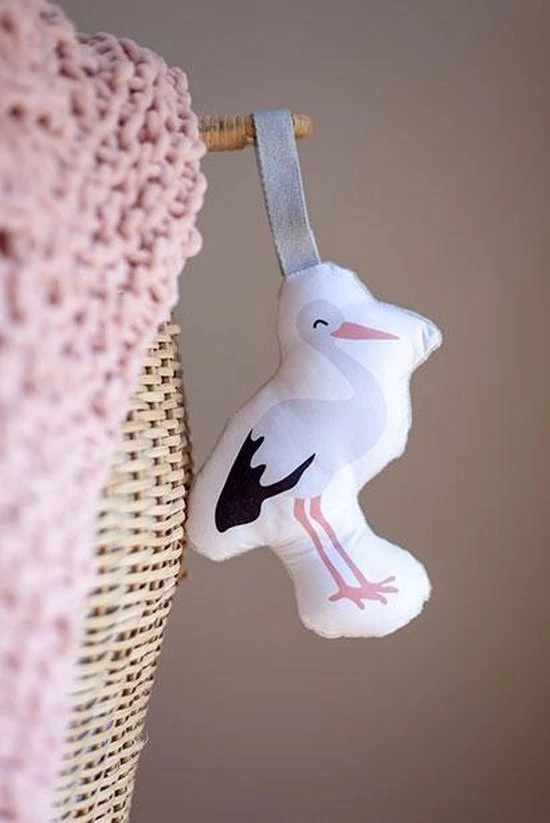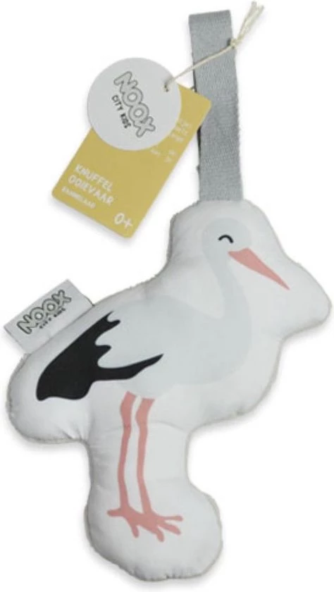 Wat is die ooievaar lekker zacht! De pootjes van de ooievaar knisperen zachtjes en wanneer je hem heen en weer schudt ratelt hij vrolijk. Door het klittenband kun je hem overal aan hangen en mee naartoe nemen.