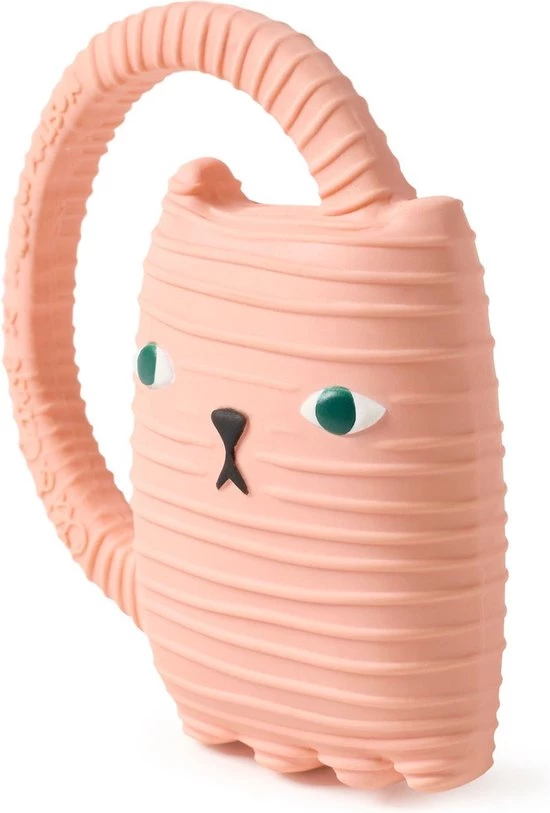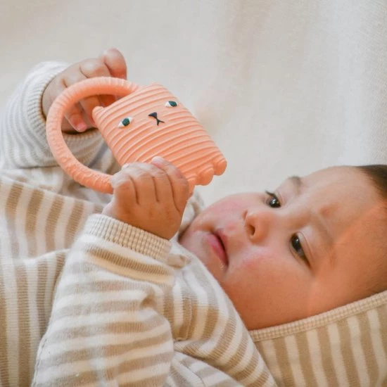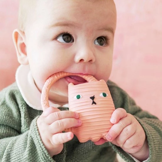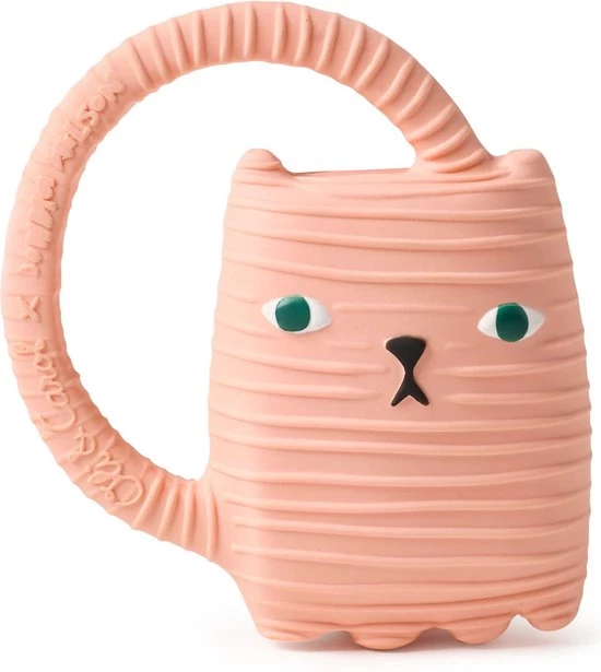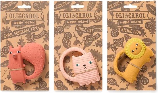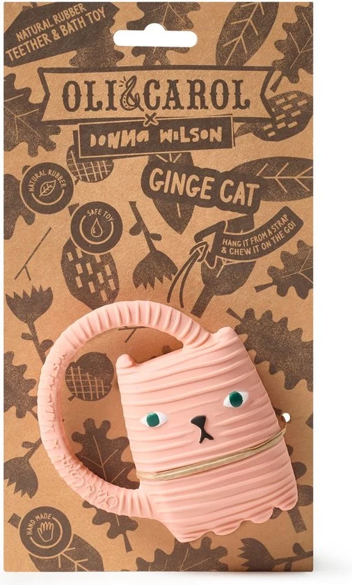 Bijtspeeltje en badspeeltje Ginge de kat met ring van Oli&Carol , dit bijt- en badspeeltje is ontworpen door de bekende ontwerpster Donna Wilson en is gemaakt van 100% organisch rubber en geverfd met organische verf. Het badspeeltje kan gebruikt worden in bad omdat er geen ventiel in het speeltje zit kan er geen water achterblijven en komen er geen bacterieen aan de binnenkant, daarbij is het als bijstpeeltje erg fijn bij doorkomende tandjes en geïrriteerd tandvlees. Door op het bijtspeeltje te bijten kalmeert het tandvlees een beetje wat baby’s uiteraard erg fijn vinden. Door de ring kunnen baby’s het bijtspeeltje makkelijk vastpakken, afwassen met water en zeep