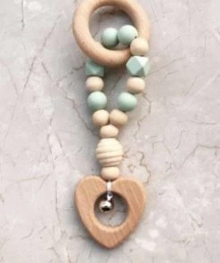 De bijtring is gemaakt van siliconen kralen en onbehandeld hout.