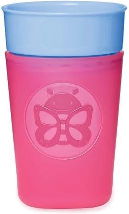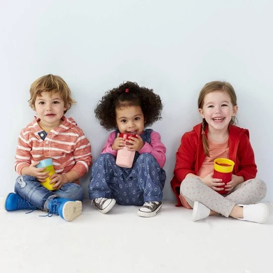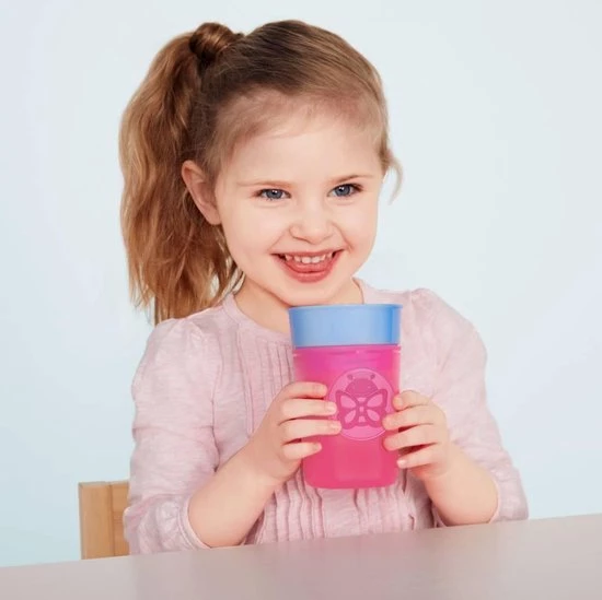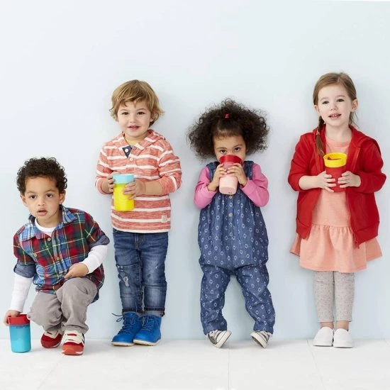 Deze alles-in-éénoplossing vergemakkelijkt de overgang voor peuters van een anti-lekbeker naar een beker voor ‘de grote kinderen’. De beker heeft een vierkante onderkant en kan ingesteld worden voor een trage en snelle vloeisnelheid. Het sluitbare deksel is ideaal voor onderweg! Zodra de training afgerond is, kan je het deksel eraf halen en de standaardbeker aan je geoefende drinker geven.