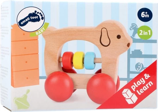 Deze hond kan rijden en rammelen! De drie houten ringen in het midden zorgen ervoor dat de beer rammelt en de grip vorm zorgt ervoor dat de rammelaar makkelijk kan worden vastgepakt.