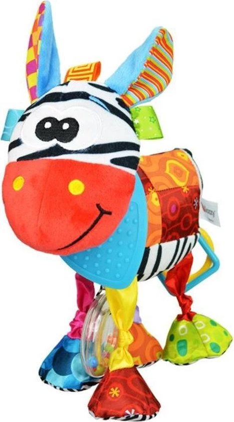 Op zoek naar een vrolijke en kleurrijke rammelaar, knuffel of bijtring? Dan bent u bij het juiste adres! Deze rammelaar, knoffel en bijtring in 1 heeft ook nog eens een hele vrolijke uitstraling.