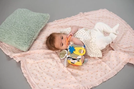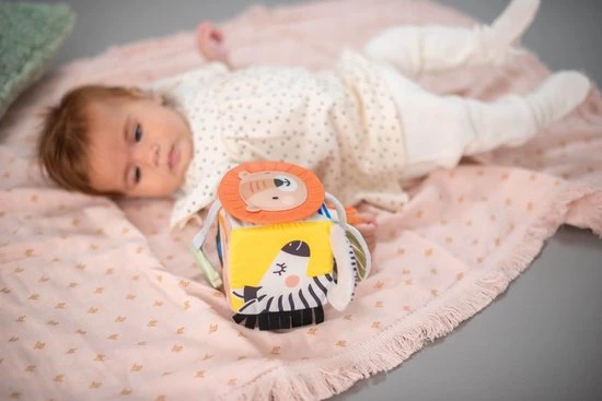 De zachte speelkubus uit de Savannah Adventures collectie zit vol activiteiten, illustraties, verrassende texturen en rinkelende geluidjes. Je baby ontwikkelt zijn verbeelding, zintuigen en motoriek door te spelen met alle vormen en functies die deze kubus te bieden heeft. Gemakkelijk aan het park of de kinderwagen te bevestigen via de plastic ring.